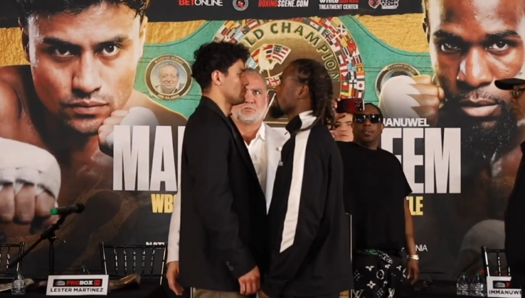เลสเตอร์ มาร์ติเนซ และ อิมมานูเวล อาลีม เดินทางมาถึงคิวชั่งน้ำหนักเป็นคู่แรกในวันศุกร์ โดยทั้งคู่ชั่งน้ำหนักต่ำกว่าเกณฑ์ 168 ปอนด์เล็กน้อย เปิดทางให้การชกชิงตำแหน่งแชมป์เฉพาะกาลแชมป์โลก WBC รุ่นซูเปอร์มิดเดิลเวตที่จะชกกันเช้าวันอาทิตย์นี้เดินหน้าได้ตามกำหนด